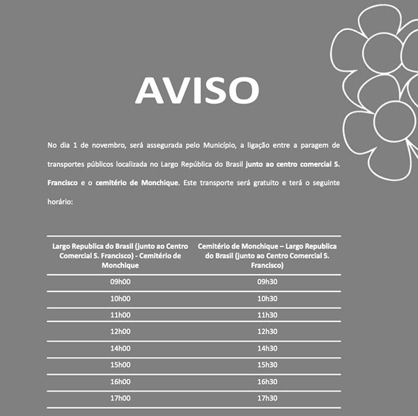 "Com utilização gratuita, o trajeto rodoviário será efetuado entre a paragem de transportes públicos localizada no Largo República do Brasil, junto ao Centro Comercial São Francisco, e o Cemitério de Monchique", indica o município.