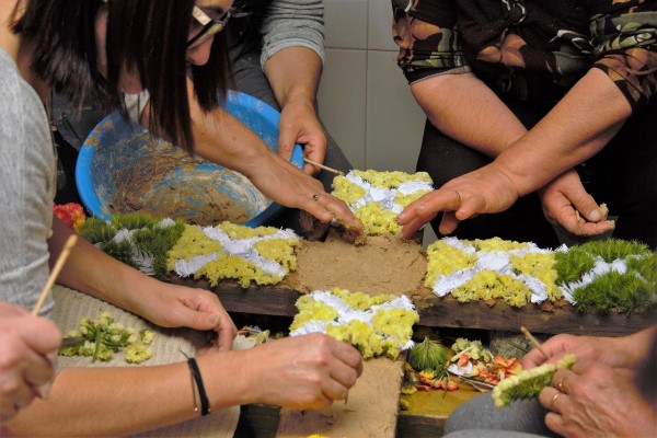 Essa reunião de mulheres – já há pelo menos uma cruz com homens como mordomos, refira-se – congrega protagonistas acima dos 60 anos, mulheres na ordem dos 30 e dos 40 anos, e crianças ainda à espera dos 10, onde fervilha a transmissão de conhecimento entre gerações. “As pessoas estão dispostas a continuar, porque passa dentro da família. A Ângela Fontão, com mais de 30 anos, já traz a filha, de sete. Já vem há três anos, para se ir habituando. Já sabe alagar o chorão. Descasca aquilo tudo para lhes entregar”, realça.